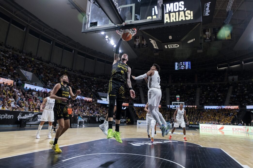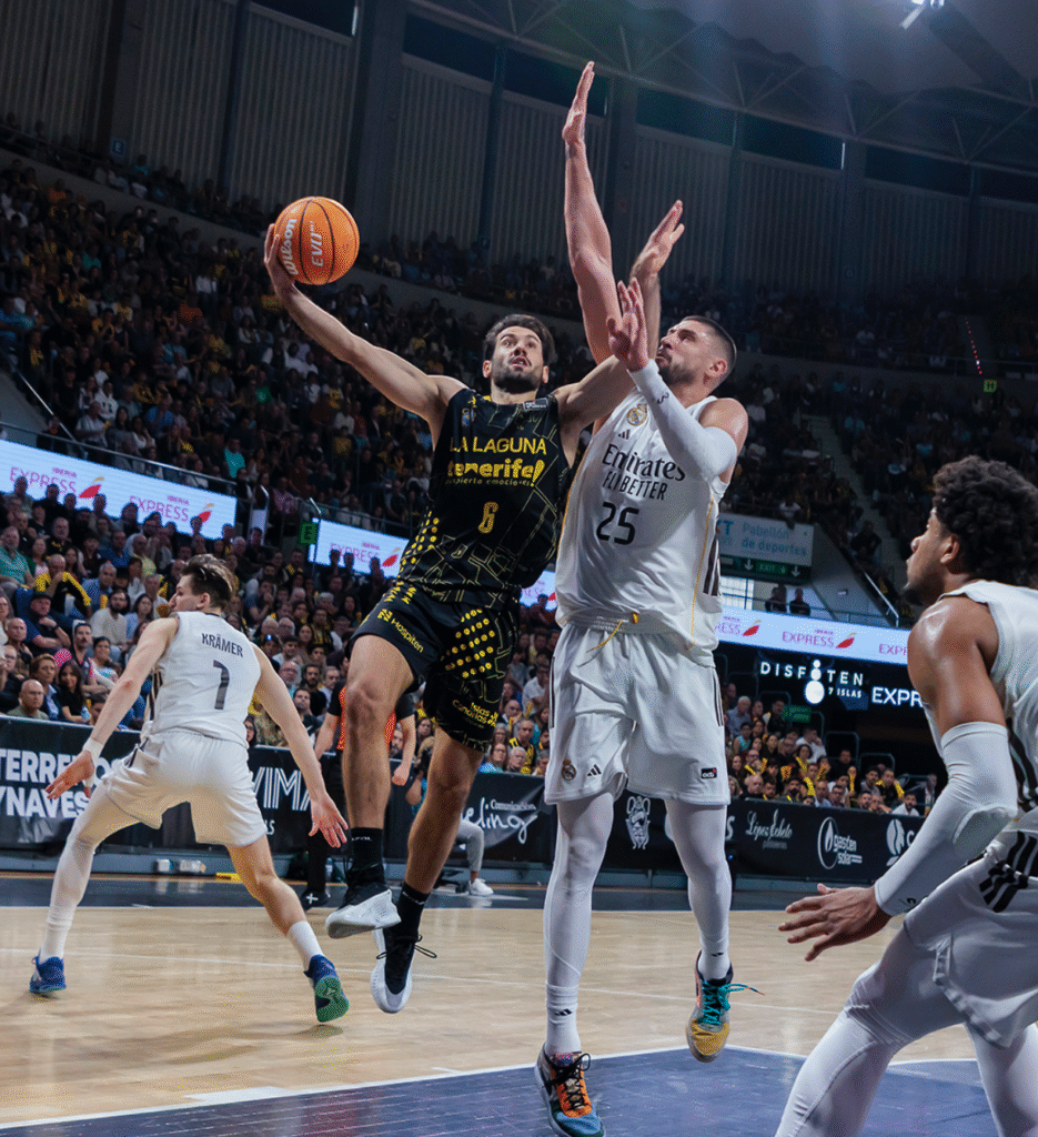 Es más, en varias ocasiones los tinerfeños tuvieron posesión para ponerse incluso por delante camino del cierre (48-49, 51-52, 53-54), pero no había manera. El Real Madrid cogió algo de oxígeno mediado el último cuarto (53-60, 63-69), pero encontró siempre la valiente reacción de los insulares. En ese escenario, y con el Santiago Martín totalmente volcado, un mate de Fran Guerra para el 65-69 y el posterior 3+1 de Aaron Doornekamp pusieron las tablas en el electrónico (69-69), con 49 segundos para el final y la caldera de los Majuelos en plena ebullición.